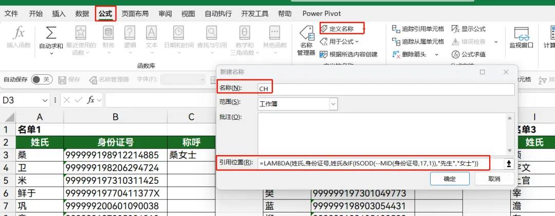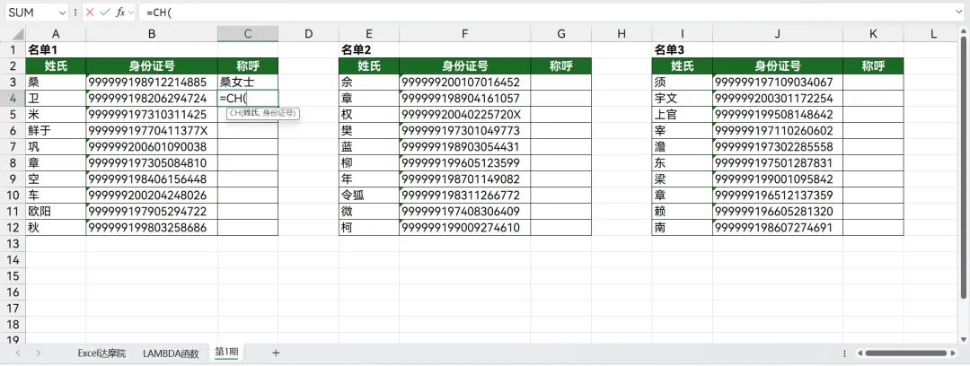 有3个名单,来回复制公式也麻烦,如果使用LAMBDA函数,将以上公式定义为CH,会简便很多。