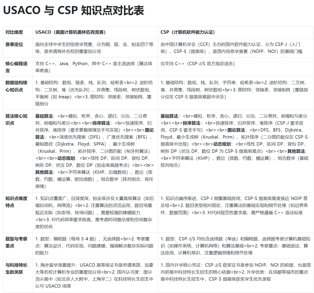 最近有位成都家长在社群里焦虑提问:“孩子初二,目标藤校 CS 专业,现在准备编程竞赛还来得及吗?哪些竞赛最有含金量?” 作为指导过 47 名学员进入斯坦福、MIT 等名校的田洪川老师(清华大学出版社《大话数据库》作者、CCF 认证信奥教练),今天就用藤校招生官视角,揭秘 “美国 Top30 计算机专业最认可的 3 类竞赛” 。USACO:藤校 CS 专业的 “黄金敲门砖” 💎“如果只能推荐一个竞赛,我永远选 USACO(美国计算机奥林匹克竞赛)。”田老师的观点背后有硬核数据:2024 年 MIT 早申阶段, 78% 录取的中国学生拥有 USACO 铂金级成绩 ,远超其他竞赛。USACO 分铜、银、金、铂金四级,每年举办 4 轮比赛,成绩直接对接美国 TOP50 大学计算机系。成都七中 2023 届李同学凭借铂金级证书,同时斩获斯坦福和 CMU 录取,招生官在面试中特别提到:“USACO 成绩比 AP 计算机 5 分更能证明你的算法思维。”备赛优势 :与国内 CSP-J/S 知识点高度重合!科创少年 2024 年数据显示,CSP-S 一等奖学员冲击 USACO 银级通过率达 92%,比纯国际体系学生快 3 个月入门。