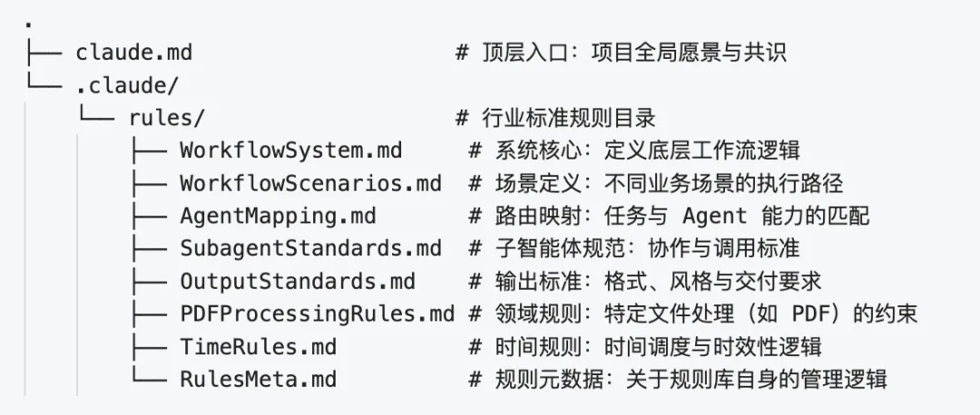 我目前的迁移标准分为三层。项目上下文存放于 rules 文件夹,涵盖所有角色都需要的最大公约数。