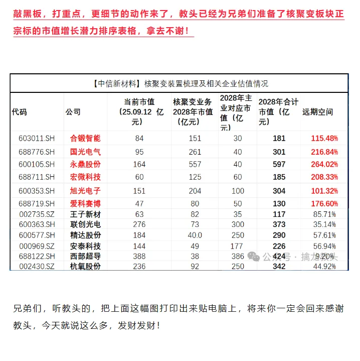 温故而知新,教头开始写号就在写核聚变,还特别提醒兄弟们要把这个板块,干!这篇文章里的截图打印出来,贴在电脑上,兄弟们回头看看里边的股票都怎么样了!