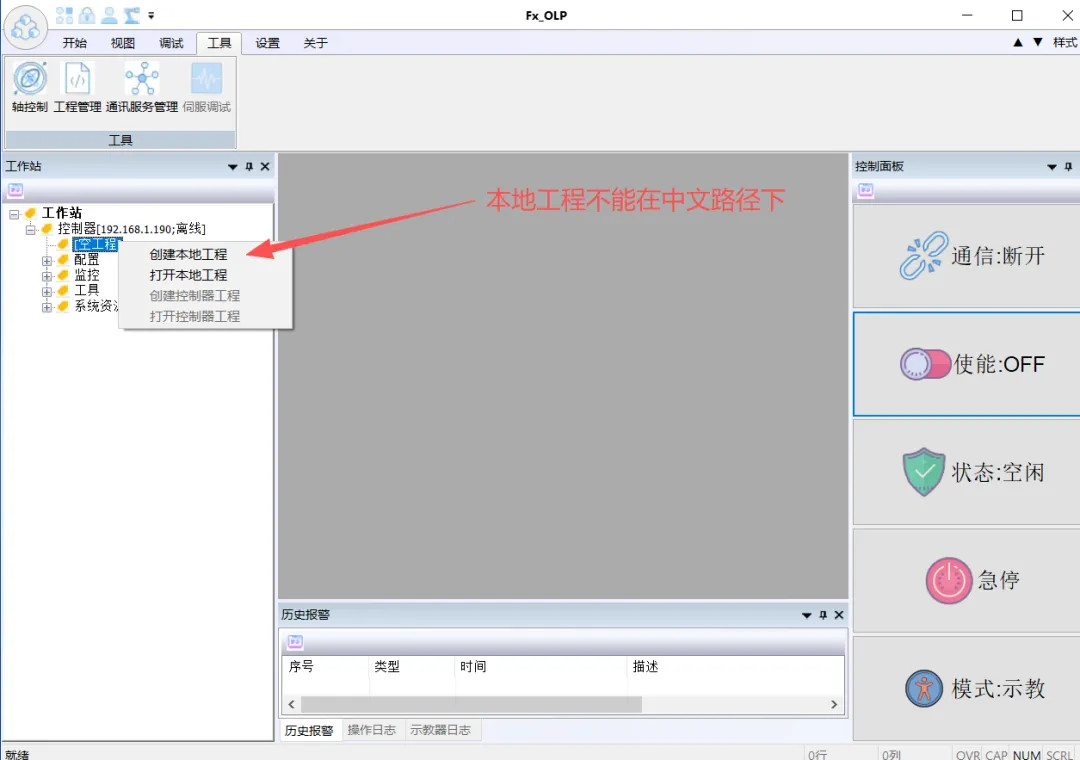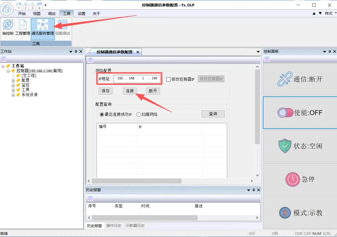 2.3 打开Fx_OLP.exe软件,选择工具—通讯服务管理—填入机器人IP地址—连接。