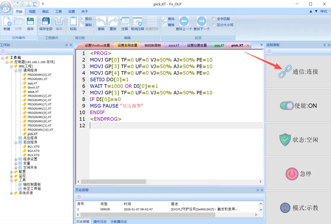 2.4 右侧通信显示连接,此时软件会读出机器人已打开的工程文件,然后就可以在线编程或修改其他参数了(修改程序后记得选择左上角的保存)