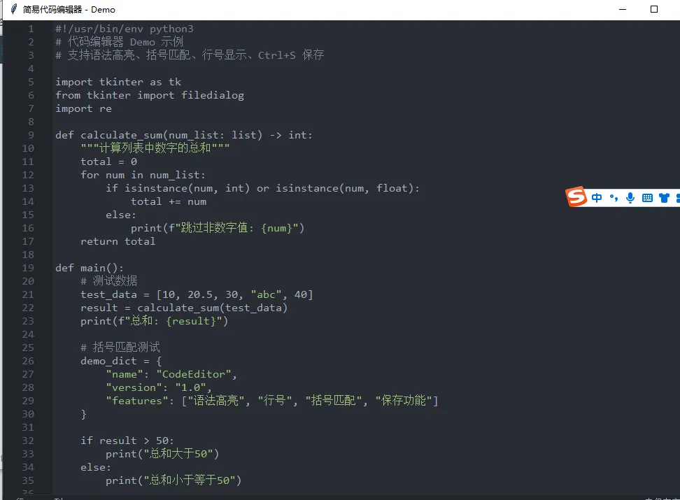 # 支持语法高亮、括号匹配、行号显示、Ctrl+S 保存