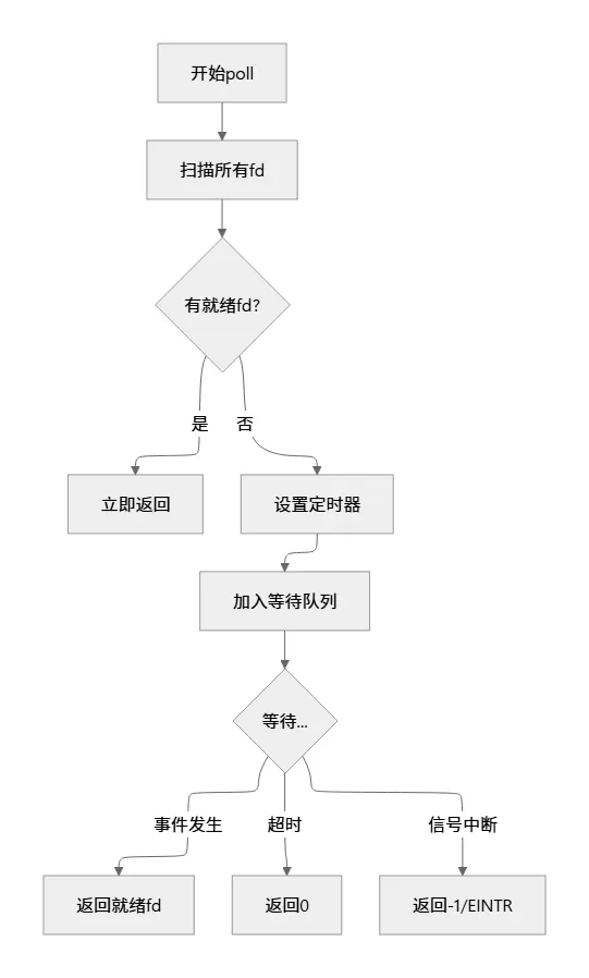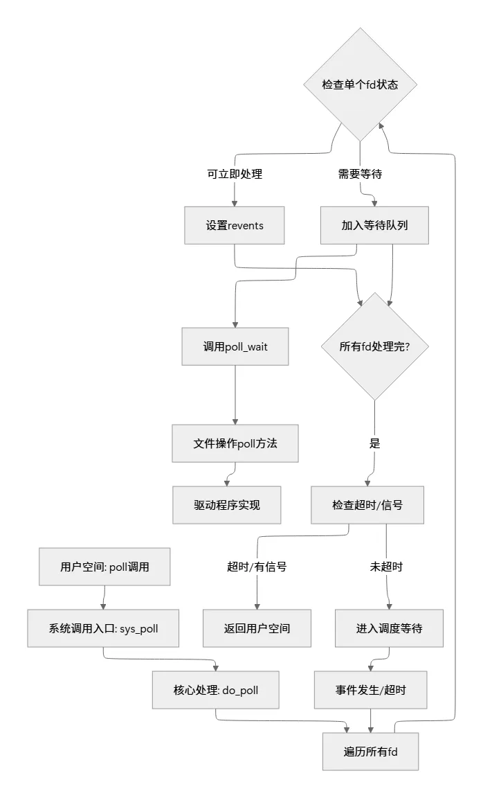 // 简化的系统调用入口SYSCALL_DEFINE3(poll, struct pollfd __user *, ufds, unsigned int, nfds, int, timeout_msecs){struct timespec64 end_time, *to = NULL; int ret; // 处理超时时间 if (timeout_msecs >= 0) { to = &end_time; poll_select_set_timeout(to, timeout_msecs / MSEC_PER_SEC, NSEC_PER_MSEC * (timeout_msecs % MSEC_PER_SEC)); } // 核心处理 ret = do_sys_poll(ufds, nfds, to); // 处理可能的信号中断 if (ret == -ERESTARTNOHAND) { // 重新启动逻辑 } return ret;}