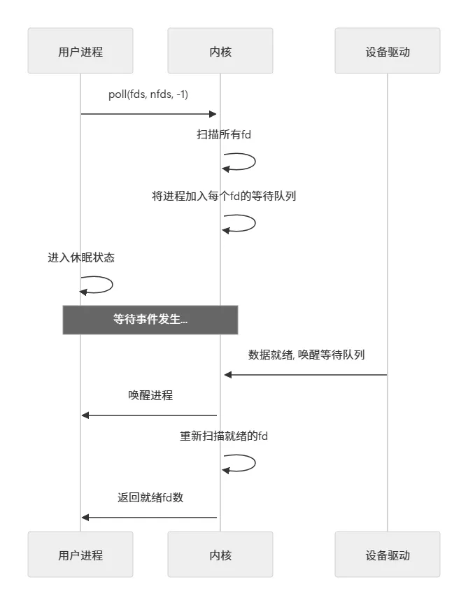 #include <poll.h>struct pollfd { int fd; /* 文件描述符 */ short events; /* 关注的事件 */ short revents; /* 返回的事件 */};