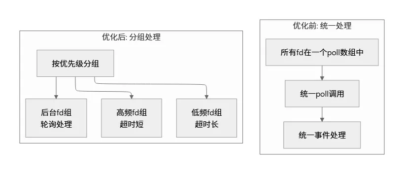 // 优化前: 固定超时while (1) { ret = poll(fds, nfds, 100); // 总是等待100ms // 处理事件}// 优化后: 动态超时while (1) { int timeout = calculate_dynamic_timeout(); ret = poll(fds, nfds, timeout); if (ret == 0) { // 超时, 处理后台任务 handle_background_tasks(); continue; } // 处理事件}