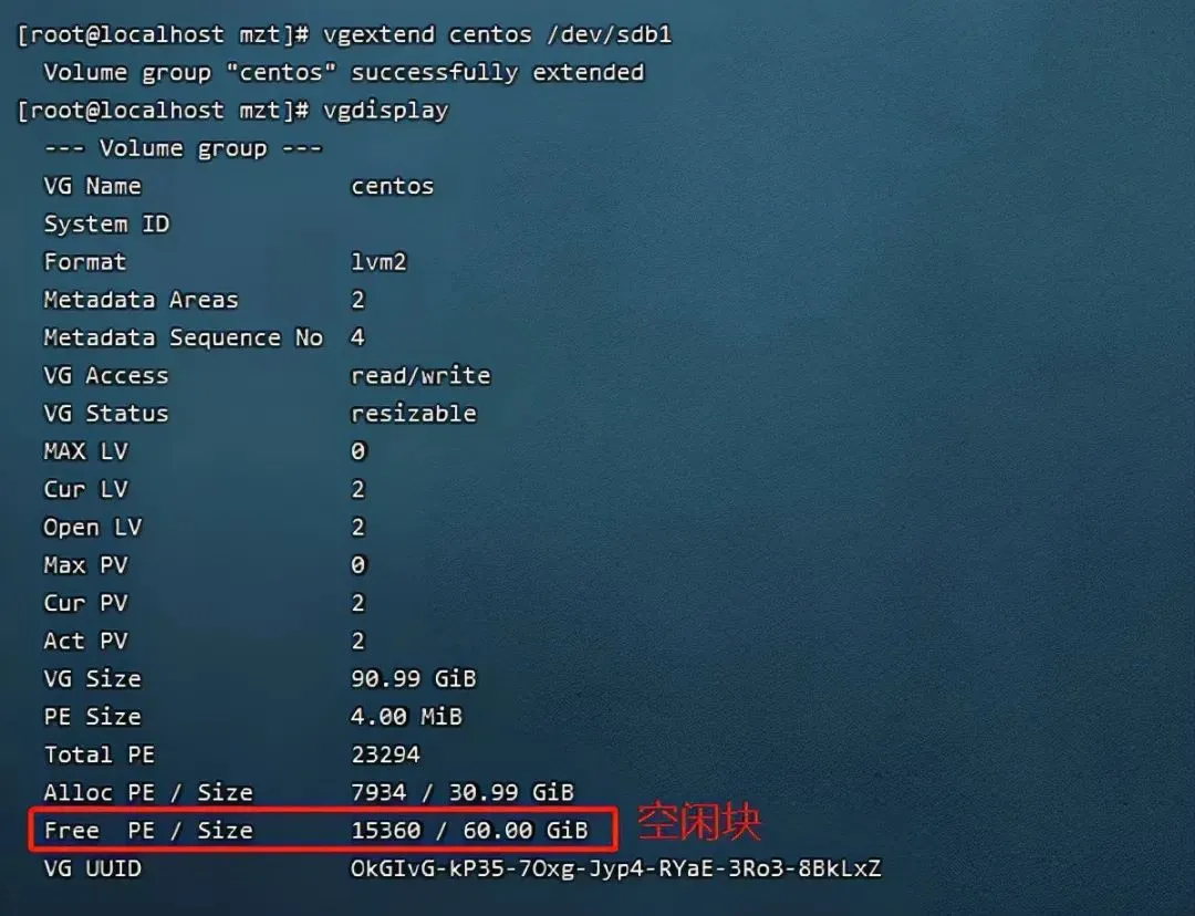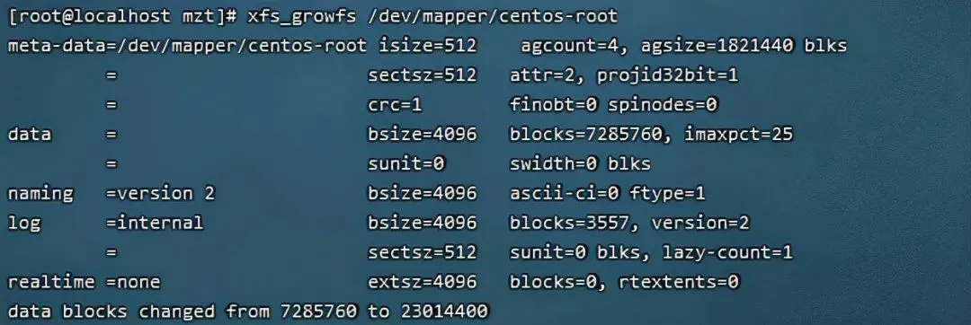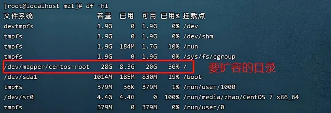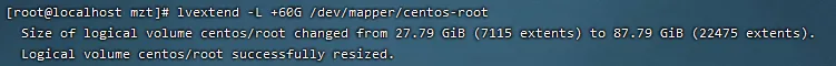 通过 lvextend 命令扩展根目录挂载点 /dev/mapper/centos-root