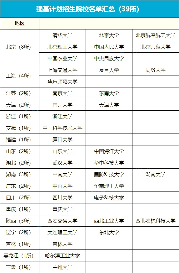 目前,39所985高校均开展强基计划招生,院校种类覆盖理工类、综合类和特色类院校等,分布全国各个省市,基本囊括各位考生家长的报考需求。