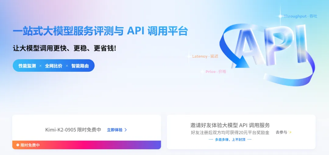 平台核心优势包括:多供应商统一调用——一套接口切换不同供应商;性能数据可视化——实时展示吞吐、延迟、价格、可靠性等关键指标;智能路由——高峰时段自动选择最优供应商保障稳定性。目前 GLM-4.7、MiniMax-M2.1、DeepSeek-V3.2 等旗舰模型可免费体验,更有邀请好友双方各得20元算力点的活动,上不封顶。