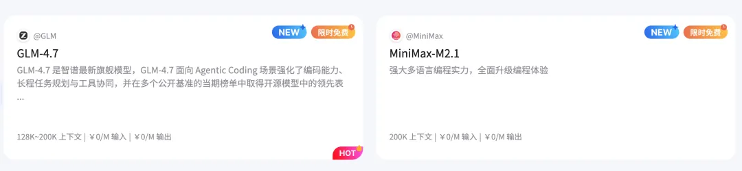 目前GLM-4.7 MiniMax-M2.1 限时免费,小伙伴们,赶紧行动起来吧!