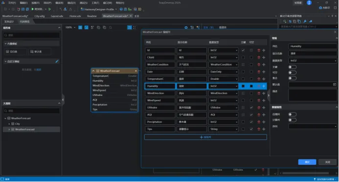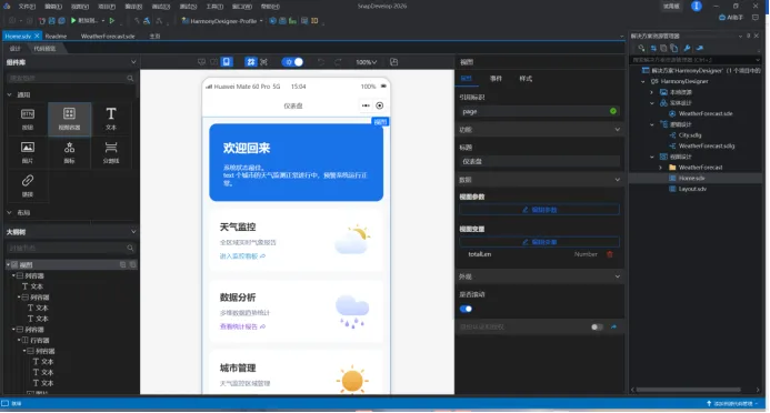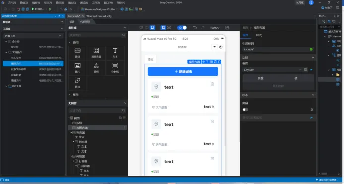 下图是在制作鸿蒙系统上天气软件时使用AI助手的截图。关于AI助手与低代码功能的总结: 在功能集成层面,AI助手虽已内置,但目前需用户自行配置第三方API密钥,且实测中未完全呈现宣传视频所演示的低代码辅助选项,在易用性与开箱即用体验上仍有优化空间。然而,在低代码UI设计环节,设计师可以直接在视图设计器中,通过拖拽“按钮”、“下拉菜单”、“卡片”等组件,快速搭建出“今晚吃点啥”的页面原型。更重要的是,他们可以直接在属性面板中将一个下拉菜单的选项数据源绑定到后台“获取菜系列表”的API,将“推荐菜品”按钮的点击事件绑定到另一个处理逻辑。该功能不仅加速了界面原型的实现,也为业务人员参与设计、企业快速验证产品理念提供了支持,整体上增强了平台的实用价值与用户体验。