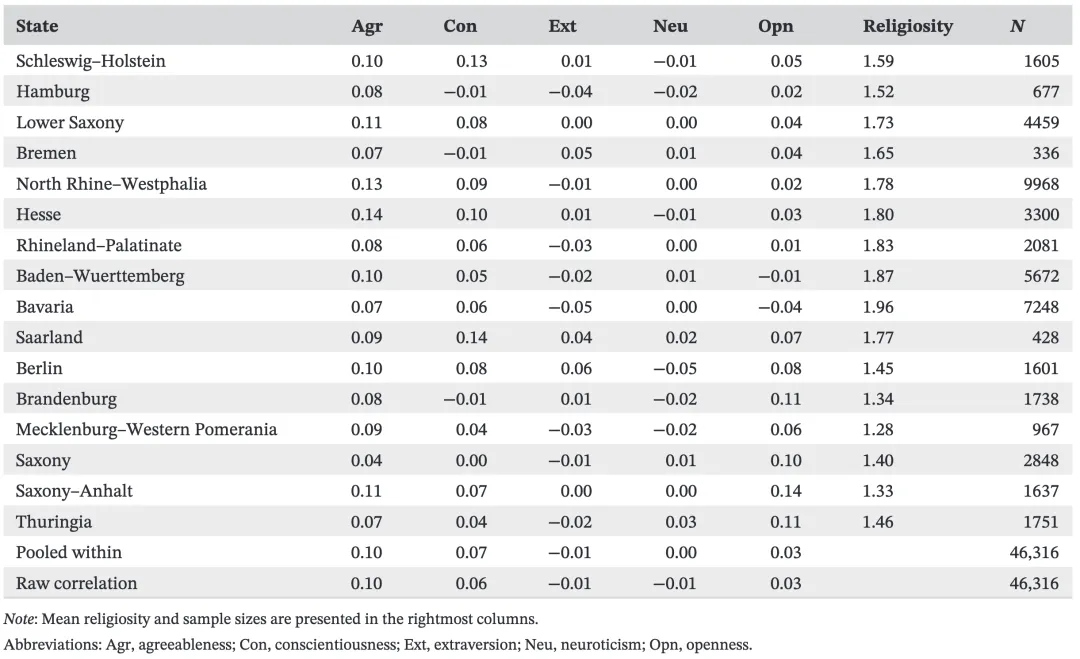 首先,作者把所有波次的数据汇总在一起,检验了宗教与大五人格各维度之间的整体相关性。
