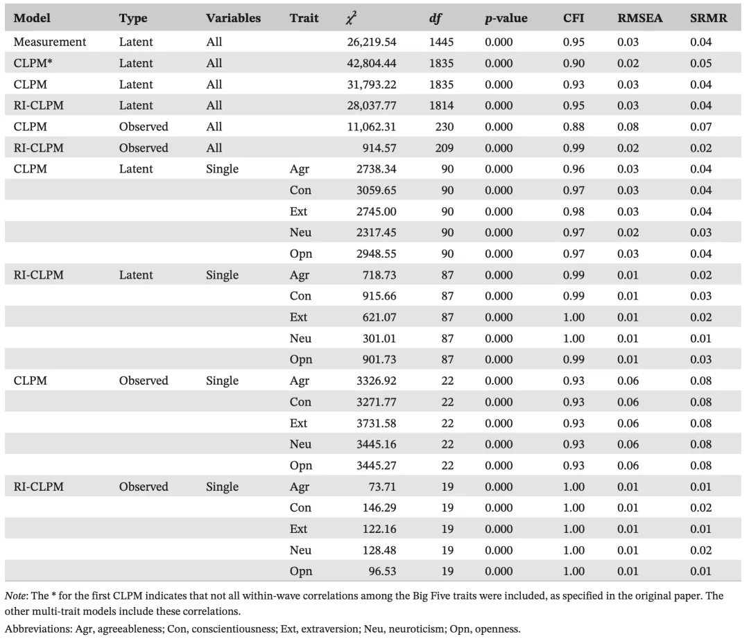他按照观测变量/潜变量、全特质/单特质纳入、CLPM/RI-CLPM这三个维度,一共组合出了8个不同的模型,同时完全复刻了一遍原研究的CLPM模型,进行对比。