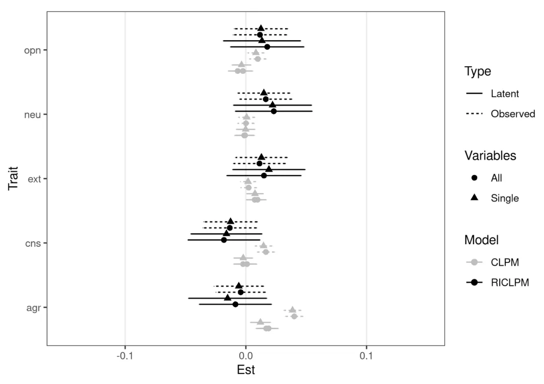 拟合优度完胜:不论是潜变量还是观测变量,不论特质是同时还是单独纳入,RI-CLPM的模型拟合度都显著优于传统的CLPM。