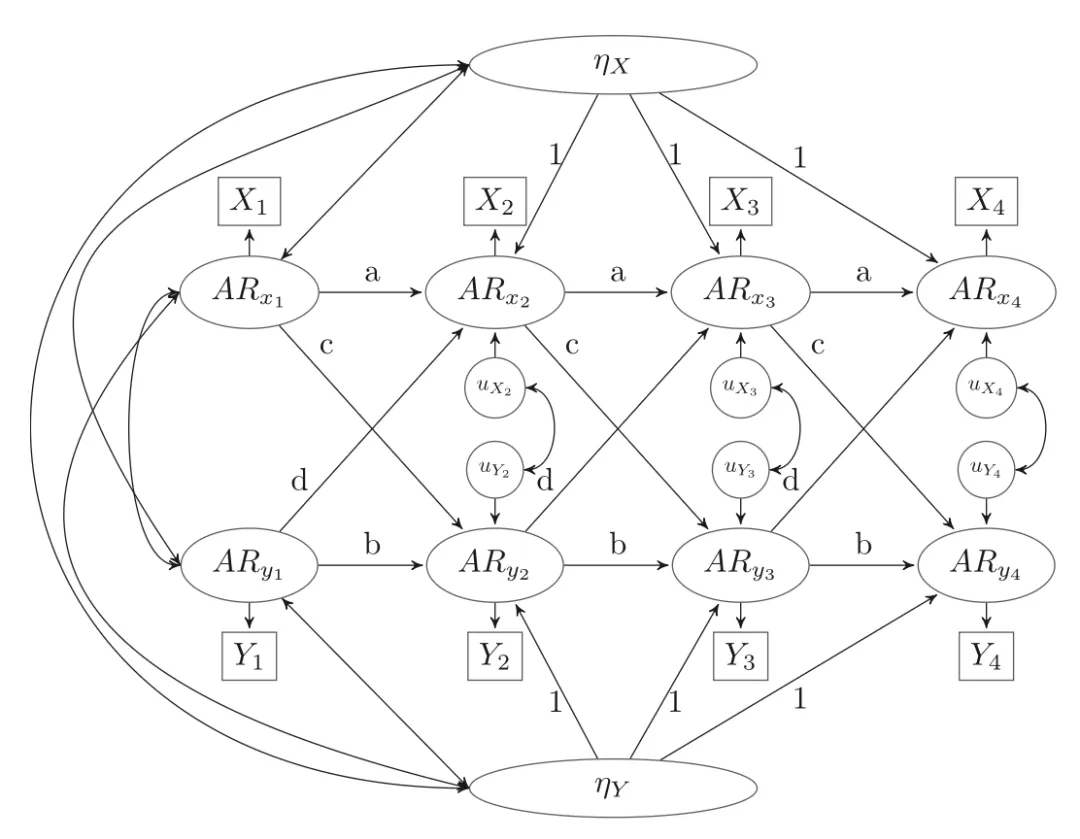 CLPM有一个核心假设,它认为除了变量自身的稳定性(自回归效应)和跨时间的相互影响(滞后效应)外,就没有其他稳定性来源了。