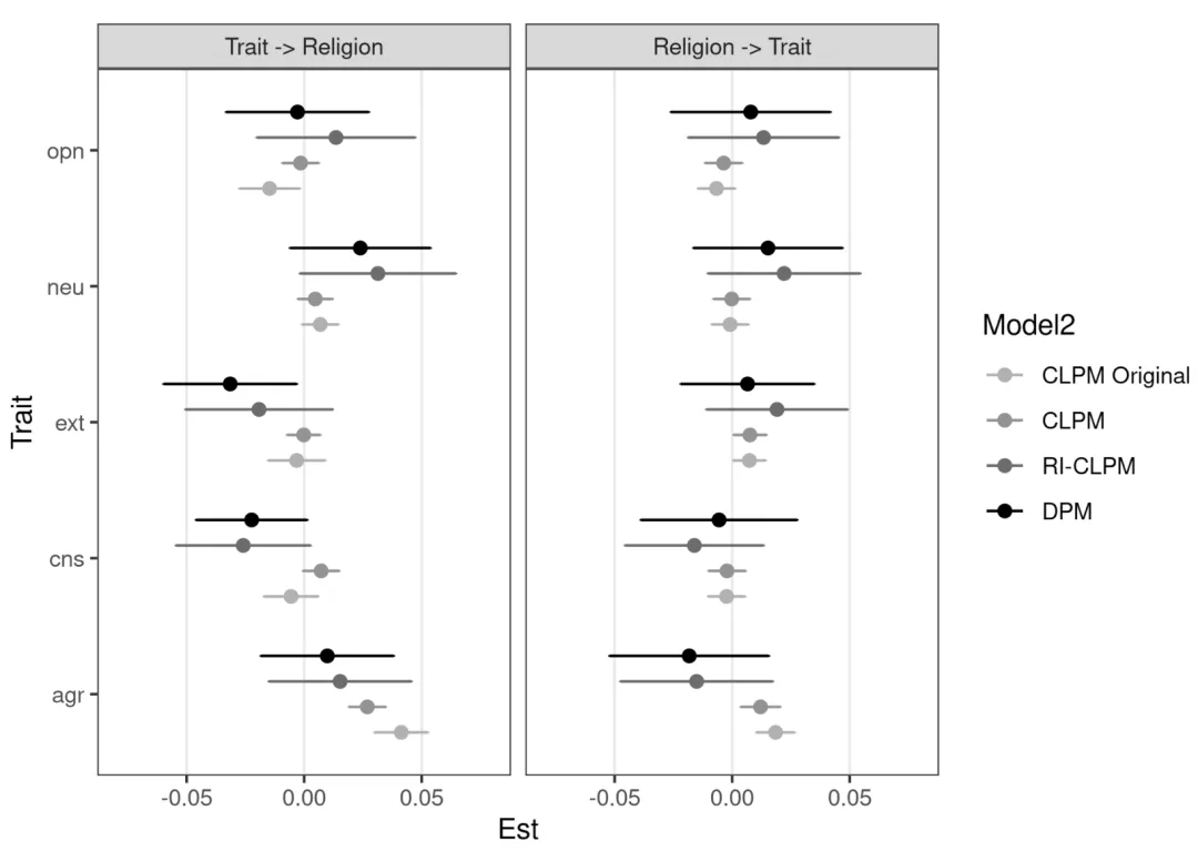 选择不同的模型,结果可能天差地别,而更符合现实规律的RI-CLPM告诉我们:人格和宗教之间的双向因果可能并不存在。