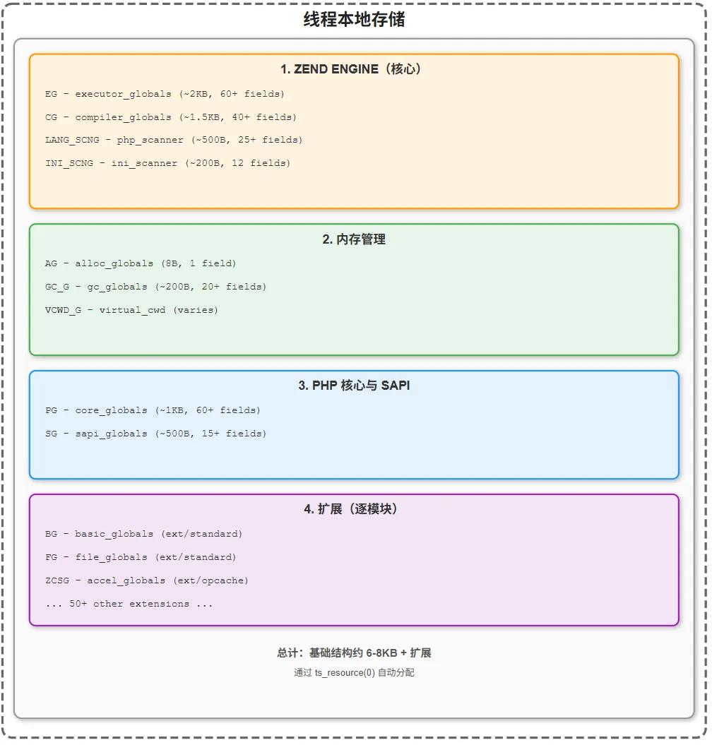 PHP 使用 线程本地存储(TLS) 按线程保存 VM 状态。这对 ZTS(Zend Thread Safety)模式下的线程隔离至关重要。