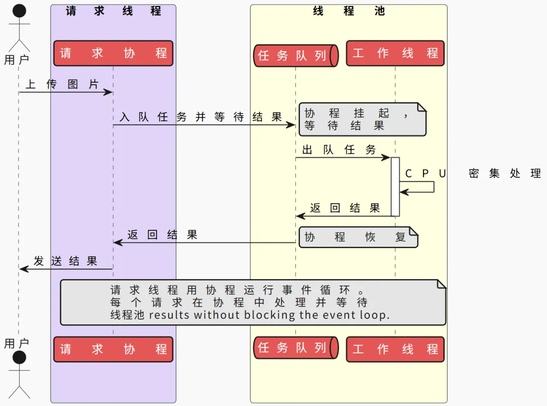 Thread + Coroutine architecture图中是示例架构:应用包含两个线程池——并发处理请求的线程池,以及处理 CPU 密集任务的 worker 池。协程处理一个请求时,可以完全暂停,等待 worker 完成重任务后再继续。