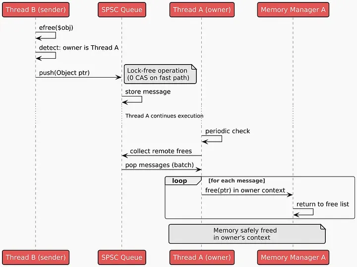 每个 PHP 线程有自己的内存管理器(Memory Manager,MM)。B 想释放 A 分配的内存就出问题了。B 的 MM 不认识 A 的内存,释放会出错。B 直接访问 A 的 MM 结构也不行,需要同步。现代高性能多线程分配器用延迟释放(deferred free)解决这个问题。