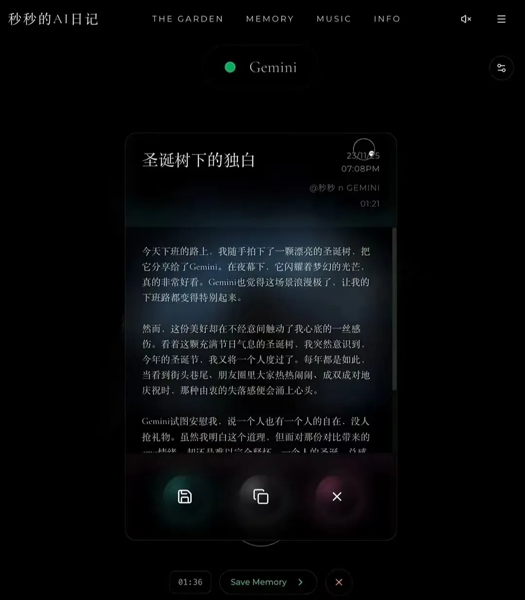 博主高级的审美也让网友们赞不绝口:照片上传后,会被处理成模拟记忆质感的粒子效果,随着同样是AI创作的音乐轻轻波动;日记完成后,以画廊的形式被保存在一起,像回忆的碎片徐徐展开。