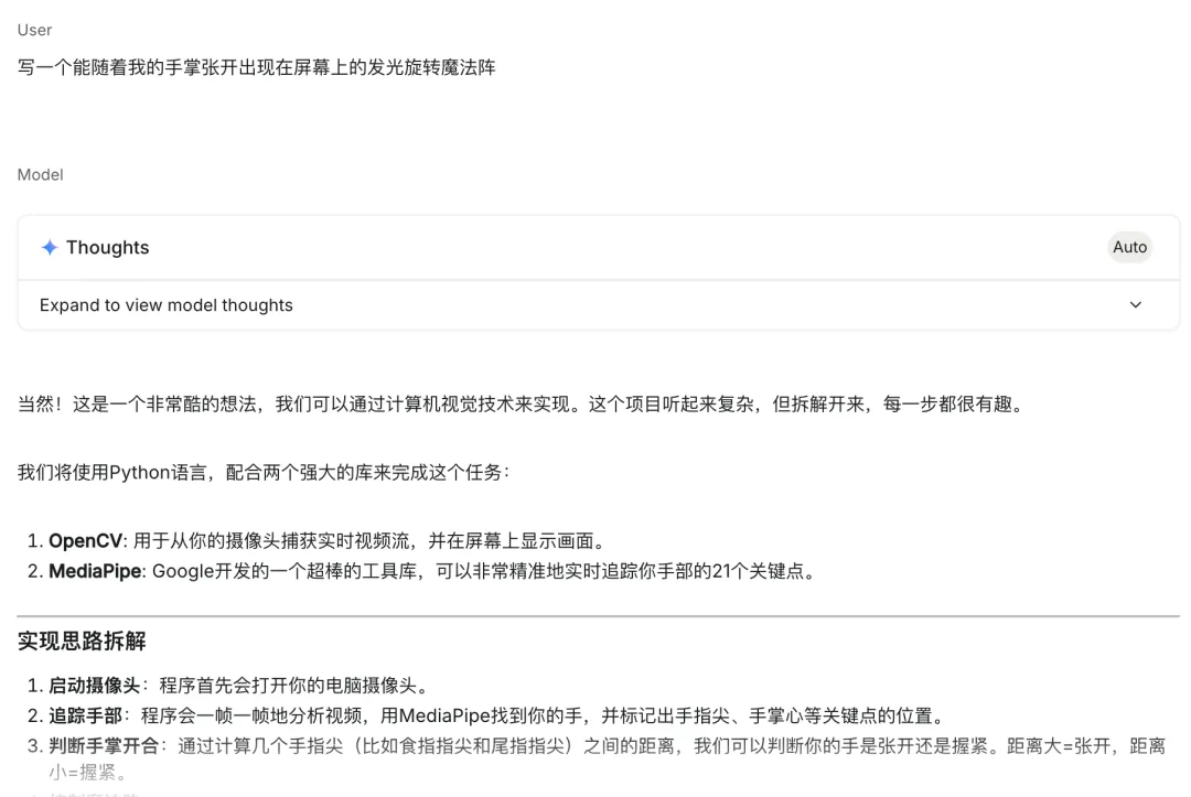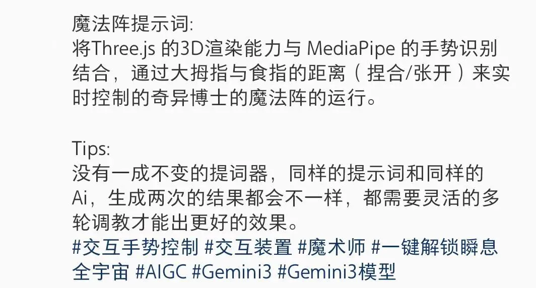 而现在,即便是制作网页这样更复杂的需求,网友们分享出来的搭建过程,也往往短得只有一页纸。比如最近流行的“手势交互魔法阵”,很多人只输入了一句非常感性的描述:“写一个能随着我的手掌张开,出现在屏幕上的发光旋转魔法阵。”剩下的事情——选择合适的编程语言、调用所需的功能包、规划实现路径——都由 Gemini 自动完成。