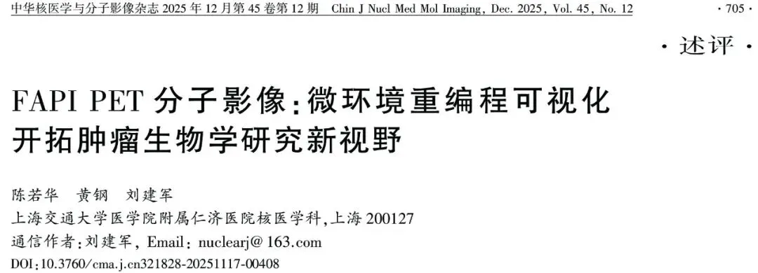 引用本文:陈若华,黄钢,刘建军.FAPI PET分子影像:微环境重编程可视化开拓肿瘤生物学研究新视野[J] . 中华核医学与分子影像杂志, 2025, 45(12) : 705-707.DOI:10.3760/cma.j.cn321828-20251117-00408