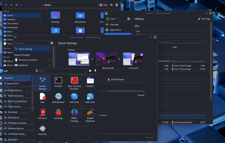 GNOME 49的使用,看起来更清晰、手感更流畅。同时Totem视频播放器已被新的Showtime应用取代,应用网格终于像菜单一样将Kali工具整理到文件夹中,使查找所需工具变得更加直观。
