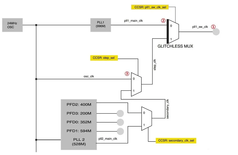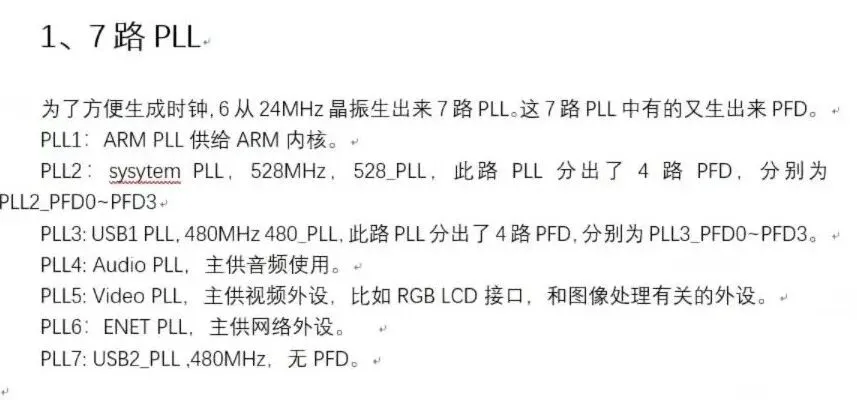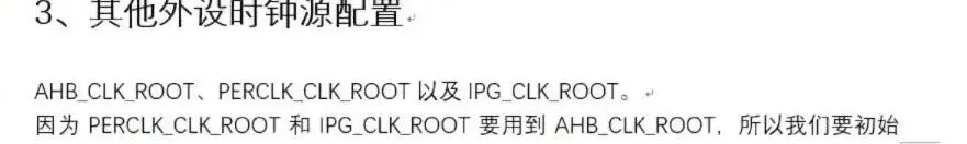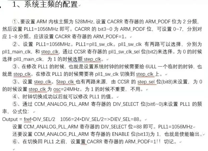 /*初始化时钟*/void imx6u_clkinit(void){ unsigned int reg = 0;//初始化6U的主频为528MHzif(((CCM->CCSR >> 2) & 0X1) == 0)//当前时钟使用pll1_main_clk也就是pll1 { CCM->CCSR &= ~(1 << 8);//设置step_clk = osc_clk=24M CCM->CCSR |= (1 << 2);//pll1_sw_clk = 24MHz }//设PLL1=1056MHz CCM_ANALOG->PLL_ARM = (1 << 13) | ((88 << 0) & 0X7f); CCM->CACRR = 1;//设置2分频 CCM->CCSR &= ~(1 << 2);//设置pll1_sw_clk=pll1_main_clk=1056MHz//设置PLL2的4路PFD reg = CCM_ANALOG->PFD_528; reg &= ~(0X3F3F3F3F); reg |= (32 << 24); //PLL2_PFD3=297MHz reg |= (24 << 16); //PLL2_PFD2=396MHz reg |= (16 << 8 ); //PLL2_PFD1=594MHz reg |= (27 << 0 ); //PLL2_PFD0=352MHz CCM_ANALOG->PFD_528 = reg;//设置PLL2的4路PFD reg = 0; reg = CCM_ANALOG->PFD_480; reg &= ~(0X3F3F3F3F); reg |= (19 << 24); //PLL3_PFD3=454.7MHz reg |= (17 << 16); //PLL3_PFD2=508.2MHz reg |= (16 << 8 ); //PLL3_PFD1=540MHz reg |= (12 << 0 ); //PLL3_PFD0=720MHz CCM_ANALOG->PFD_480 = reg;//设置AHB_CLK_ROOT=132MHz CCM->CBCMR &= ~(3 << 18); CCM->CBCMR |= 1 << 18;//pre_periph_clock=PLL2_PFD2=396MHz CCM->CBCDR &= ~(1 << 25);while(CCM->CDHIPR & (1 << 5));/* CCM->CBCDR &= ~(7 << 10); CCM->CBCDR |= (2 << 10);//3分频 while(CCM->CDHIPR & (1 << 1));//等待握手信号完成*///IPG_CLK_ROOT=66MHz CCM->CBCDR &= ~(3 << 8); CCM->CBCDR |= (1 << 8);//IPG_CLK_ROOT=AHB_CLK_ROOT=132/2=66MHz//PER_CLK_ROOT=66MHz CCM->CSCMR1 &= ~(1 << 6);//PER_CLK_ROOT时钟源为IPG_CLK_ROOT=66MHz CCM->CSCMR1 &= ~(0X3f << 0);//1分频,PER_CLK_ROOT=66MHz}