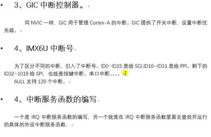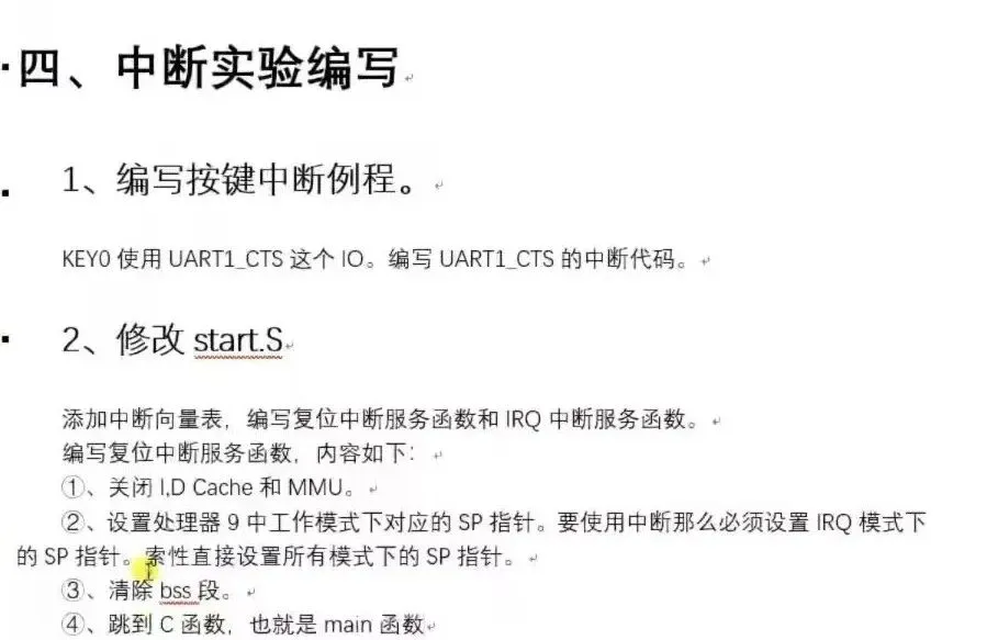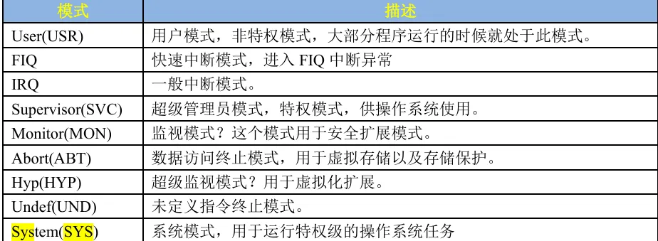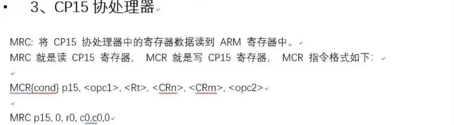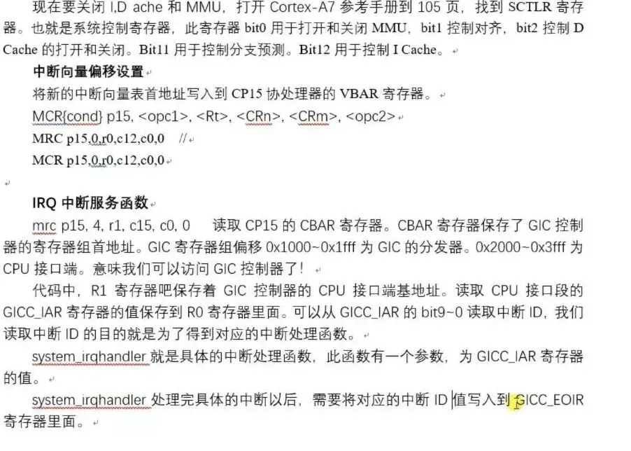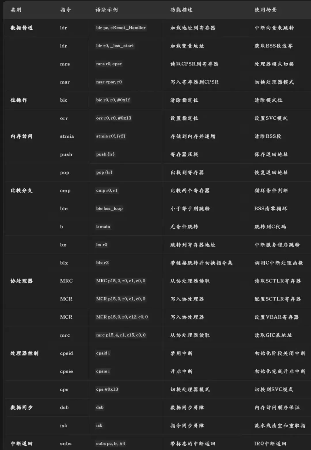 .global _start.global _bss_start_bss_start: .word _bss_start.global _bss_end_bss_end: .word _bss_end_start: ldr pc, =Reset_Handler/*复位中断服务函数 */ ldr pc, =Undefined_Handler/*未定义指令中断服务函数 */ ldr pc, =SVC_Hander/*SVC */ ldr pc, =PreAbort_Handler/*预取终止 */ ldr pc, =DataAbort_Handler/*数据终止 */ ldr pc, =NotUsed_Handler/*未使用 */ ldr pc, =IRQ_Handler/*IRQ中断 */ ldr pc, =FIQ_Handler/*FIQ中断 *//*复位中断服务函数 */Reset_Handler: cpsid i /*关闭IRQ *//*关闭I/D cache和MMU *修改SCTLR寄存器,采用读-改-写的方式 */ MRC p15, 0, r0, c1, c0, 0/*读取SCTLR寄存器的数据到r0寄存器里面 */ bic r0, r0, #(1 << 12) /*关闭Icache */ bic r0, r0, #(1 << 11) /*关闭分支预测 */ bic r0, r0, #(1 << 2 ) /*关闭Dcache */ bic r0, r0, #(1 << 1 ) /*关闭对齐 */ bic r0, r0, #(1 << 0 ) /*关闭MMU */ MCR p15, 0, r0, c1, c0, 0/*将r0寄存器里面的数据写入到SCTLR里面 *//*设置中断向量偏移 */ ldr r0, =0x87800000 dsb/*数据同步 */ isb/*指令同步 */ MCR p15, 0, r0, c12, c0, 0/*设置VBAR寄存器=0x87800000 */ dsb isb/*清除BSS段 */ ldr r0, _bss_start ldr r1, _bss_end mov r2, #0bss_loop: stmia r0!, {r2} cmp r0, r1/* 比较R0和R1里面的值*/ ble bss_loop/* 如果R0地址小于等于R1,继续清除BSS段*//*设置处理器进入IRQ模式 */ mrs r0, cpsr /*读取cpsr到r0 */ bic r0, r0, #0x1f/*清除cpsr的bit4-0*/ orr r0, r0, #0x12/*使用IRQ模式*/ msr cpsr, r0 /*将r0写入到cpsr */ ldr sp, =0x80600000/*设置SP指针 *//*设置处理器进入SYS模式 */ mrs r0, cpsr /*读取cpsr到r0 */ bic r0, r0, #0x1f/*清除cpsr的bit4-0*/ orr r0, r0, #0x1f/*使用SYS模式*/ msr cpsr, r0 /*将r0写入到cpsr */ ldr sp, =0x80400000/*设置SP指针 *//*设置处理器进入SVC模式 */ mrs r0, cpsr /*读取cpsr到r0 */ bic r0, r0, #0x1f/*清除cpsr的bit4-0*/ orr r0, r0, #0x13/*使用SVC模式*/ msr cpsr, r0 /*将r0写入到cpsr */ ldr sp, =0x80200000/*设置SP指针 */ cpsie i /*打开IRQ */ b main /*跳转到C语言main函数 *//*未定义指令中断服务函数 */Undefined_Handler: ldr r0, =Undefined_Handler bx r0 /*SVC中断服务函数 */SVC_Hander: ldr r0, =SVC_Hander bx r0 /*预取终止中断服务函数 */PreAbort_Handler: ldr r0, =PreAbort_Handler bx r0 /*数据终止中断服务函数 */DataAbort_Handler: ldr r0, =DataAbort_Handler bx r0 /*未使用中断 */NotUsed_Handler: ldr r0, =NotUsed_Handler bx r0 /*IRQ中断服务函数 */IRQ_Handler: push {lr} /* 保存lr地址 */ push {r0-r3, r12} /* 保存r0-r3,r12寄存器 */ mrs r0, spsr /* 读取spsr寄存器 */ push {r0} /* 保存spsr寄存器 */ mrc p15, 4, r1, c15, c0, 0/* 从CP15的C0寄存器内的值到R1寄存器中 * 参考文档ARM Cortex-A(armV7)编程手册V4.0.pdf P49 * Cortex-A7 Technical ReferenceManua.pdf P68 P138 */add r1, r1, #0X2000 /* GIC基地址加0X2000,也就是GIC的CPU接口端基地址 */ ldr r0, [r1, #0XC] /* GIC的CPU接口端基地址加0X0C就是GICC_IAR寄存器, * GICC_IAR寄存器保存这当前发生中断的中断号,我们要根据 * 这个中断号来绝对调用哪个中断服务函数 */ push {r0, r1} /* 保存r0,r1 */ cps #0x13 /* 进入SVC模式,允许其他中断再次进去 */ push {lr} /* 保存SVC模式的lr寄存器 */ ldr r2, =system_irqhandler /* 加载C语言中断处理函数到r2寄存器中*/ blx r2 /* 运行C语言中断处理函数,带有一个参数,保存在R0寄存器中 */ pop {lr} /* 执行完C语言中断服务函数,lr出栈 */ cps #0x12 /* 进入IRQ模式 */ pop {r0, r1} str r0, [r1, #0X10] /* 中断执行完成,写EOIR */ pop {r0} msr spsr_cxsf, r0 /* 恢复spsr */ pop {r0-r3, r12} /* r0-r3,r12出栈 */ pop {lr} /* lr出栈 */ subs pc, lr, #4 /* 将lr-4赋给pc *//*FIQ中断服务函数 */FIQ_Handler: ldr r0, =FIQ_Handler bx r0关键汇编指令详解表