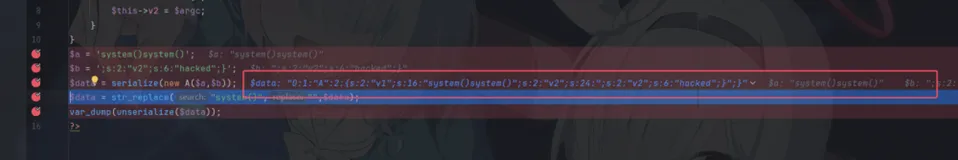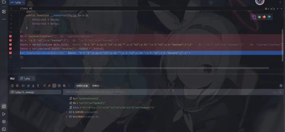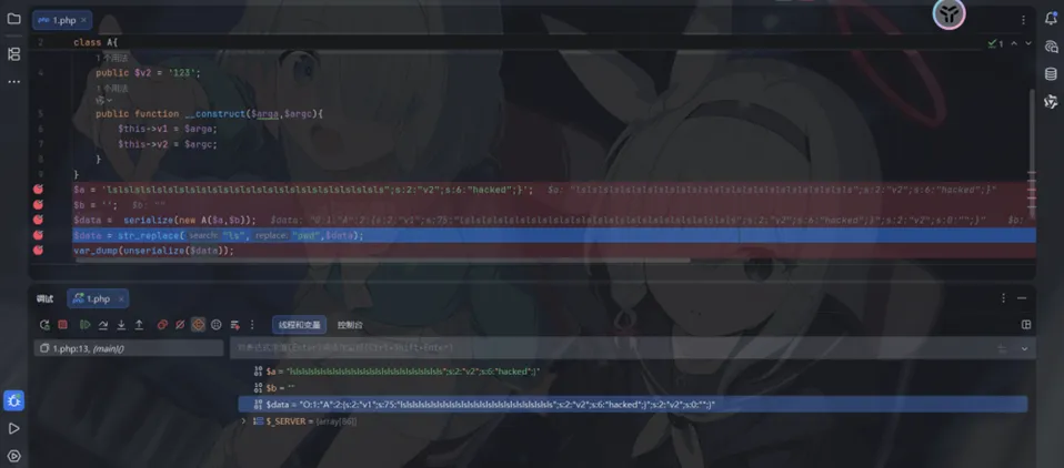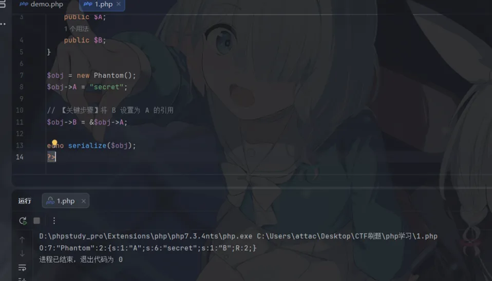 <?phpclass Phantom { public $A; public $B;}$obj = new Phantom();$obj->A = "secret";// 【关键步骤】将 B 设置为 A 的引用$obj->B = &$obj->A; echo serialize($obj);?>