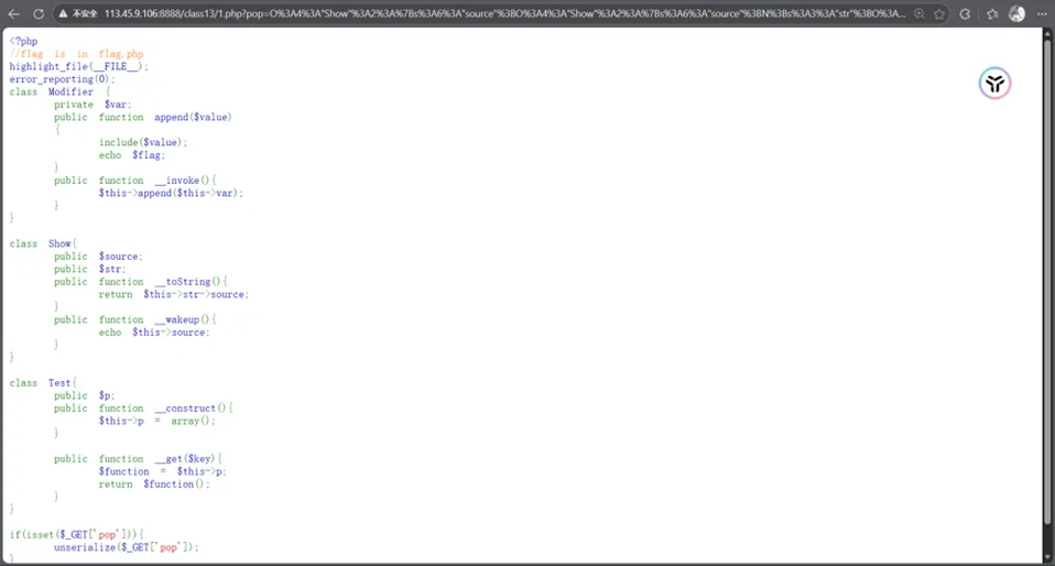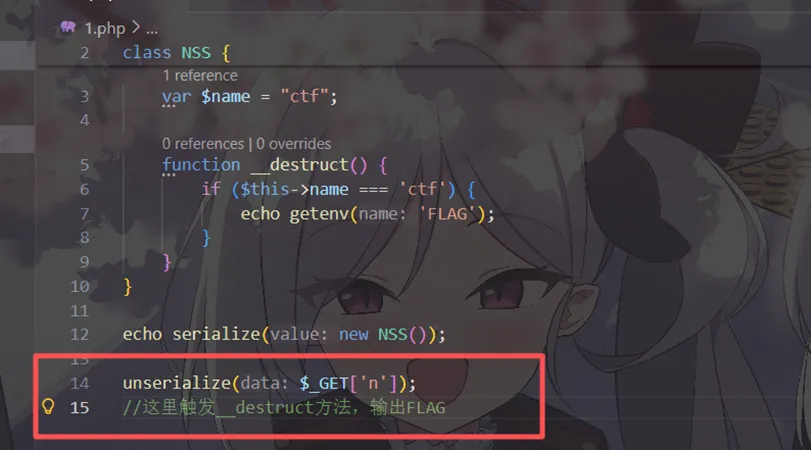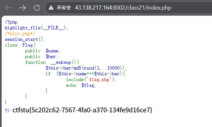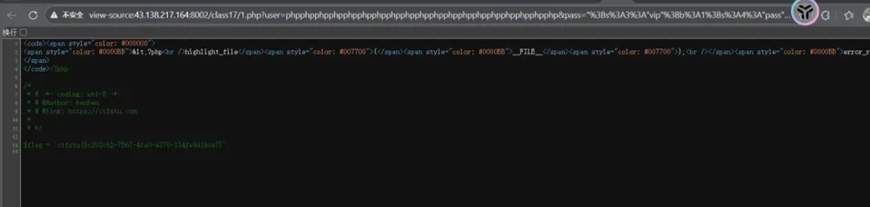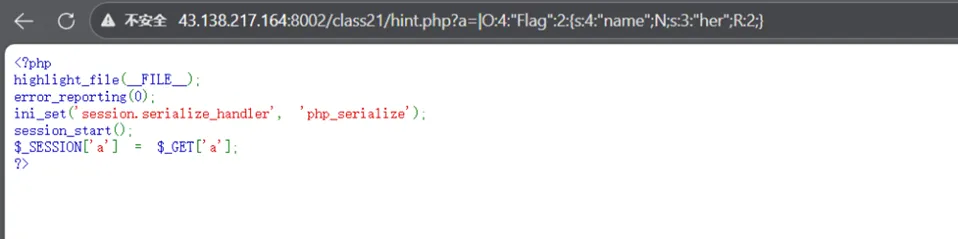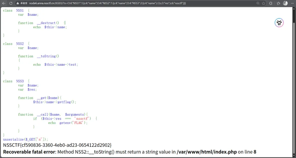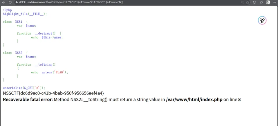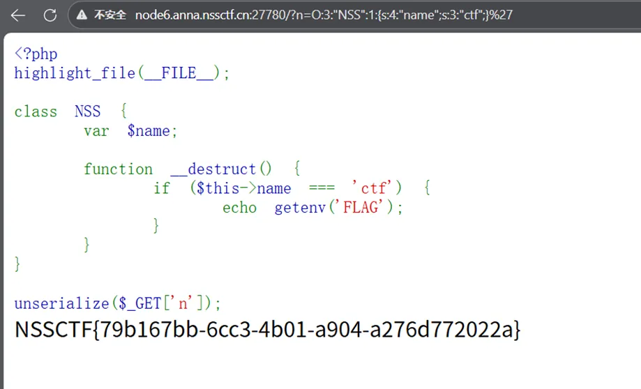 <?phpclass NSS { var $name;function__destruct() {if ($this->name === 'ctf') {echo getenv('FLAG'); } }}unserialize($_GET['n']);如果$this->name === 'ctf' 那么就输出env中的flag