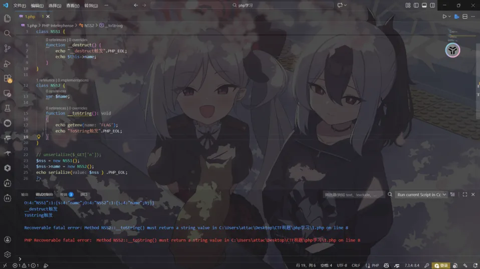 <?phpclass User { public $username; private $password; public function __construct($username, $password) {$this->username = $username;$this->password = $password; } // PHP 7.4+ 新增,优先级高于 __sleep() public function __serialize(): array {return ['user' => $this->username,'pass_hash' => md5($this->password) ]; } public function __unserialize(array $data): void {$this->username = $data['user'];$this->password = 'restored'; // 反序列化时的初始化 }}$test = new User('admin', '123456');$ser = serialize($test); // 这里触发 __serialize()$new = unserialize($ser); // 这里触发 __unserialize()var_dump($ser);?><!-- string(81) "O:4:"User":2:{s:4:"user";s:5:"admin";s:9:"pass_hash";s:32:"e10adc3949ba59abbe56e057f20f883e";}" -->【PHP 匿名类 】