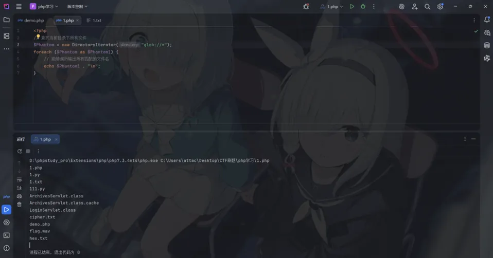 <?php// 查找目录下名字包含 flag 的文件$Phantom = new GlobIterator("*flag*");foreach ($Phantom as $Phantom1) {echo$Phantom1 . "\n";}
