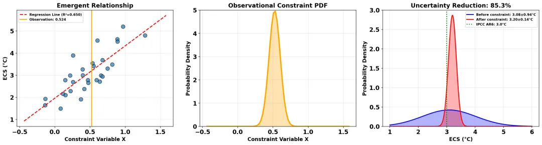 import matplotlib.pyplot as pltfig, axes = plt.subplots(1, 3, figsize=(18, 5))# 子图1:涌现关系ax = axes[0]ax.scatter(constraint_var, ecs_values, s=80, alpha=0.7, edgecolors='black')ax.plot(constraint_grid, slope * constraint_grid + intercept, 'r--', linewidth=2, label=f'Regression Line (R²={correlation**2:.3f})')ax.axvline(obs_mean, color='orange', linewidth=2, label=f'Observation: {obs_mean:.3f}')ax.set_xlabel('Constraint Variable X', fontsize=12)ax.set_ylabel('ECS (°C)', fontsize=12)ax.set_title('Emergent Relationship', fontsize=14, fontweight='bold')ax.legend()ax.grid(True, alpha=0.3)# 子图2:观测约束 PDFax = axes[1]ax.plot(constraint_grid, obs_pdf, color='orange', linewidth=3)ax.fill_between(constraint_grid, obs_pdf, alpha=0.3, color='orange')ax.set_xlabel('Constraint Variable X', fontsize=12)ax.set_ylabel('Probability Density', fontsize=12)ax.set_title('Observational Constraint PDF', fontsize=14, fontweight='bold')ax.grid(True, alpha=0.3)# 子图3:ECS 约束前后对比ax = axes[2]ecs_dense = np.linspace(1.0, 6.0, 200)original_pdf = gaussian_pdf(ecs_values.mean(), original_std, ecs_dense)constrained_pdf = gaussian_pdf(constrained_mean, constrained_std, ecs_dense)ax.plot(ecs_dense, original_pdf, 'b-', linewidth=2, label=f'Before constraint: {ecs_values.mean():.2f}±{original_std:.2f}°C')ax.fill_between(ecs_dense, original_pdf, alpha=0.3, color='blue')ax.plot(ecs_dense, constrained_pdf, 'r-', linewidth=2, label=f'After constraint: {constrained_mean:.2f}±{constrained_std:.2f}°C')ax.fill_between(ecs_dense, constrained_pdf, alpha=0.3, color='red')ax.axvline(3.0, color='green', linestyle=':', linewidth=2, label='IPCC AR6: 3.0°C')ax.set_xlabel('ECS (°C)', fontsize=12)ax.set_ylabel('Probability Density', fontsize=12)ax.set_title(f'Uncertainty Reduction: {uncertainty_reduction:.1f}%', fontsize=14, fontweight='bold')ax.legend()ax.grid(True, alpha=0.3)plt.tight_layout()plt.show()对于真实的气候模式数据(如 CMIP6),流程类似: