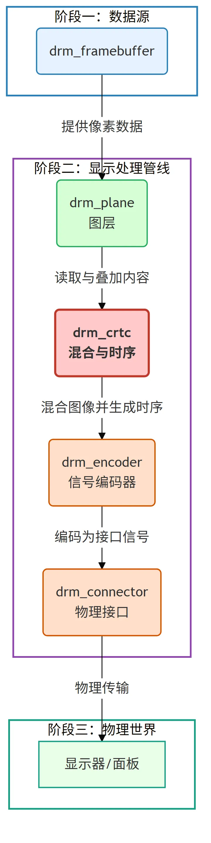 可以把像素的生命周期想象成一次旅行:它最初由 CPU 或 GPU 生成,存放在系统内存中;它的终点,是显示面板上某个发光单元。KMS 的职责,就是管理并规范这段旅程经过的每一个环节。