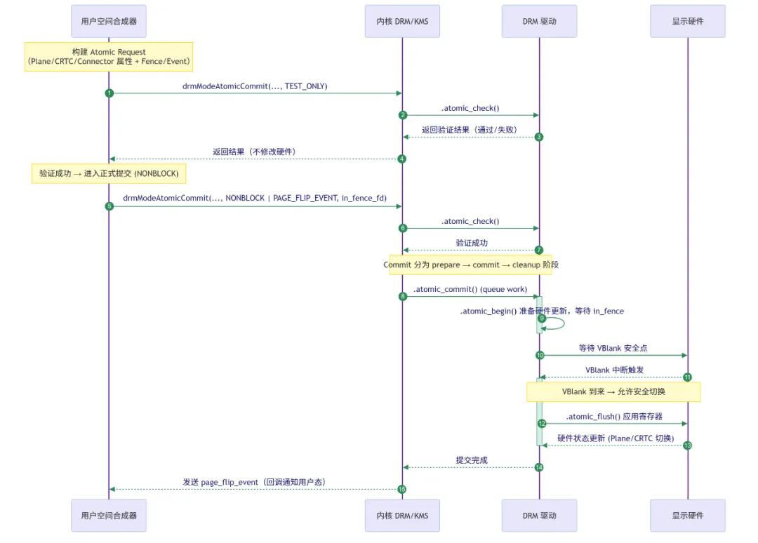 内核收到正式提交请求后,会再次完整地执行一遍验证流程(以防状态被其他进程改变)。只有在第二次验证也通过后,内核才会调用驱动的 .atomic_commit() 回调。在这个回调中,驱动会执行真正的硬件操作,通常会将所有硬件寄存器的更新,都精确地调度在下一次垂直消隐 (VBlank) 期间,一次性地、同步地应用下去,从而保证无缝切换。