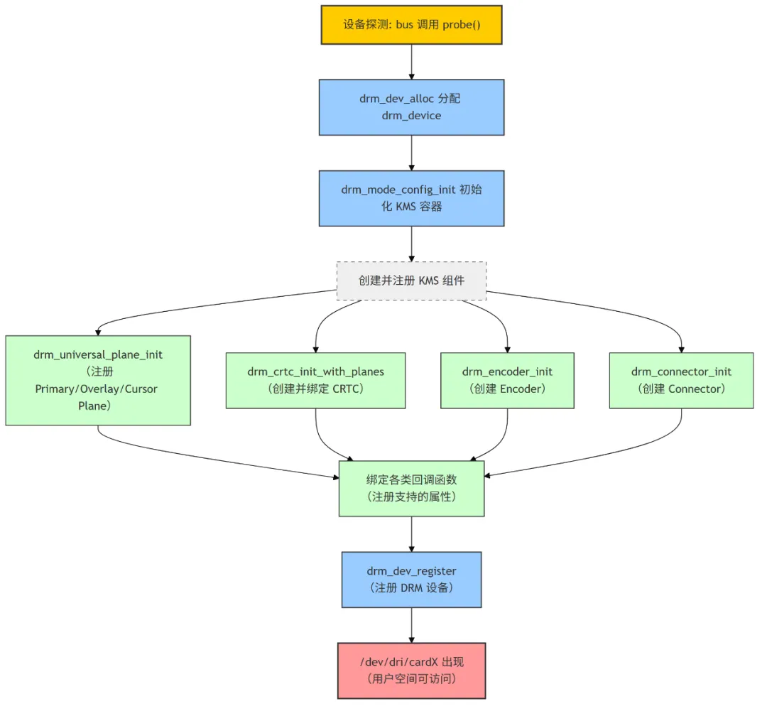 为了解决这些问题,Kernel Mode Setting (KMS) 应运而生。其核心思想是:将最底层、最核心的显示模式设置功能,统一收归到内核的 DRM(Direct Rendering Manager) 驱动中管理。
