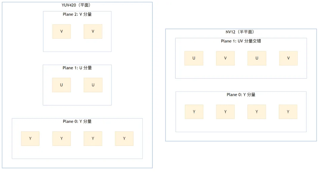 FourCC 标识。例如 DRM_FORMAT_ARGB8888、DRM_FORMAT_NV12。 - 内存布局 (Layout):包括