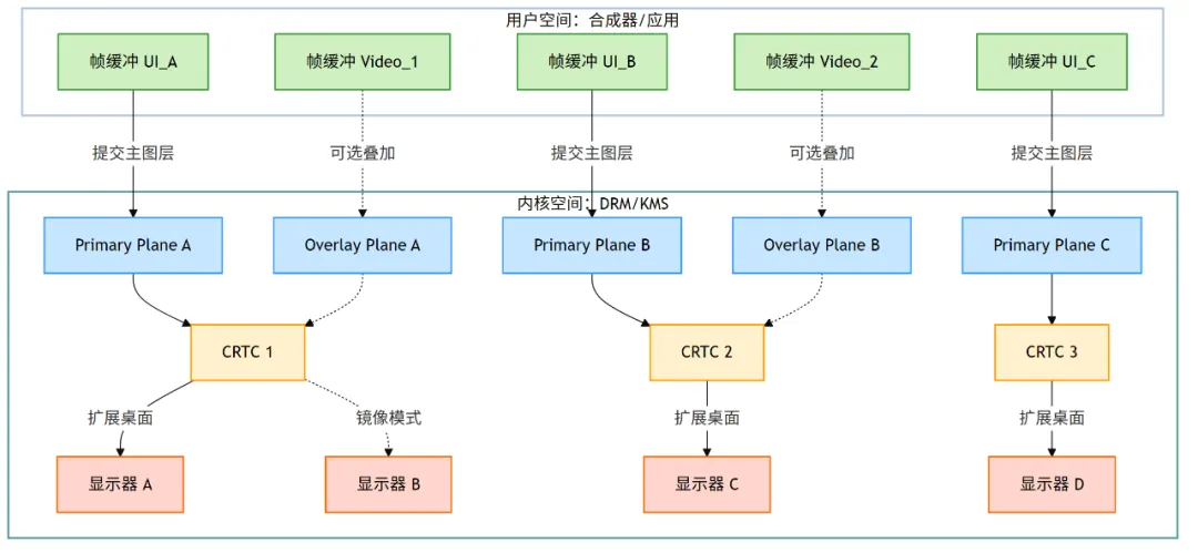 CRTC 必须绑定一个。它通常用于显示最底层内容,如桌面背景。某些硬件可能没有真正可见的 Primary Plane,仅依赖 Overlay,此时驱动会创建一个 dummy primary(虚拟/不可见的 Primary Plane)以满足框架要求。 - 叠加图层 (Overlay Plane):支持硬件加速,用于视频播放或其他叠加内容。解码后的帧可以直接交给 Overlay Plane,由显示硬件自动完成色彩空间转换和叠加,实现高效“零拷贝”播放。