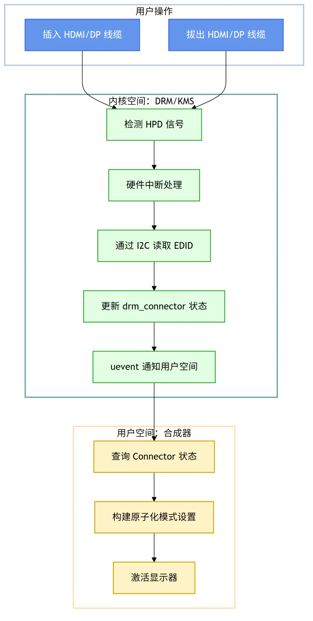 Hot-Plug Detect, HPD) 机制,感知是否有显示器连接或断开,并通知用户空间。 - 能力探测 (Capability Probing):当一个显示器被连接上时,