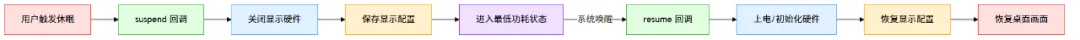 Runtime PM 主要处理设备自身的空闲状态,而当整个系统进入休眠(如“挂起到内存”,Suspend-to-RAM)时,则需要另一套机制。DRM 驱动通过实现标准的 suspend 和 resume 回调来支持系统级的电源管理。