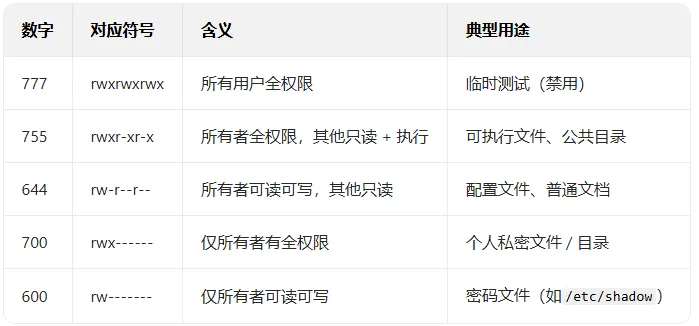 每个数字(0-7)由 3 个基础权限位组成,对应:r读权限,用4表示、w写权限用2表示、x执行权限用1表示,3个基础权限组合在一起就是对应的数字,常见权限设置如下图: