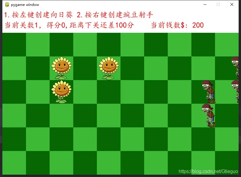 class MainGame(): # 2 创建关数,得分,剩余分数,钱数 shaoguan = 1 score = 0 remnant_score = 100 money = 200 # 3 存储所有地图坐标点 map_points_list = [] # 3 存储所有的地图块 map_list = [] # 4 存储所有植物的列表 plants_list = [] # 7 存储所有豌豆子弹的列表 peabullet_list = [] # 9 新增存储所有僵尸的列表 zombie_list = [] count_zombie = 0 produce_zombie = 100 # 1 加载游戏窗口 def init_window(self): # 1 调用显示模块的初始化 pygame.display.init() # 1 创建窗口 MainGame.window = pygame.display.set_mode([scrrr_width, scrrr_height]) # 2 文本绘制 def draw_text(self, content, size, color): pygame.font.init() font = pygame.font.SysFont('kaiti', size) text = font.render(content, True, color) return text # 2 加载帮助提示 def load_help_text(self): text1 = self.draw_text('1.按左键创建向日葵 2.按右键创建豌豆射手', 26, (255, 0, 0)) MainGame.window.blit(text1, (5, 5)) # 3 初始化坐标点 def init_plant_points(self): for y in range(1, 7): points = [] for x in range(10): point = (x, y) points.append(point) MainGame.map_points_list.append(points) print("MainGame.map_points_list", MainGame.map_points_list) # 3 初始化地图 def init_map(self): for points in MainGame.map_points_list: temp_map_list = list() for point in points: # map = None if (point[0] + point[1]) % 2 == 0: map = Map(point[0] * 80, point[1] * 80, 0) else: map = Map(point[0] * 80, point[1] * 80, 1) # 将地图块加入到窗口中 temp_map_list.append(map) print("temp_map_list", temp_map_list) MainGame.map_list.append(temp_map_list) print("MainGame.map_list", MainGame.map_list) # 3 将地图加载到窗口中 def load_map(self): for temp_map_list in MainGame.map_list: for map in temp_map_list: map.load_map() # 6 增加豌豆射手发射处理 def load_plants(self): for plant in MainGame.plants_list: # 6 优化加载植物的处理逻辑 if plant.live: if isinstance(plant, Sunflower): plant.display_sunflower() plant.produce_money() elif isinstance(plant, PeaShooter): plant.display_peashooter() plant.shot() else: MainGame.plants_list.remove(plant) # 7 加载所有子弹的方法 def load_peabullets(self): for b in MainGame.peabullet_list: if b.live: b.display_peabullet() b.move_bullet() # v1.9 调用子弹是否打中僵尸的方法 b.hit_zombie() else: MainGame.peabullet_list.remove(b) # 8事件处理 def deal_events(self): # 8 获取所有事件 eventList = pygame.event.get() # 8 遍历事件列表,判断 for e in eventList: if e.type == pygame.QUIT: self.gameOver() elif e.type == pygame.MOUSEBUTTONDOWN: # print('按下鼠标按键') print(e.pos) # print(e.button)#左键1 按下滚轮2 上转滚轮为4 下转滚轮为5 右键 3 x = e.pos[0] // 80 y = e.pos[1] // 80 print(x, y) map = MainGame.map_list[y - 1][x] print(map.position) # 8 增加创建时候的地图装填判断以及金钱判断 if e.button == 1: if map.can_grow and MainGame.money >= 50: sunflower = Sunflower(map.position[0], map.position[1]) MainGame.plants_list.append(sunflower) print('当前植物列表长度:{}'.format(len(MainGame.plants_list))) map.can_grow = False MainGame.money -= 50 elif e.button == 3: if map.can_grow and MainGame.money >= 50: peashooter = PeaShooter( map.position[0], map.position[1]) MainGame.plants_list.append(peashooter) print('当前植物列表长度:{}'.format(len(MainGame.plants_list))) map.can_grow = False MainGame.money -= 50 # 9 新增初始化僵尸的方法 def init_zombies(self): for i in range(1, 7): dis = random.randint(1, 5) * 200 zombie = Zombie(800 + dis, i * 80) MainGame.zombie_list.append(zombie) # 9将所有僵尸加载到地图中 def load_zombies(self): for zombie in MainGame.zombie_list: if zombie.live: zombie.display_zombie() zombie.move_zombie() # v2.0 调用是否碰撞到植物的方法 zombie.hit_plant() else: MainGame.zombie_list.remove(zombie) # 1 开始游戏 def start_game(self): # 1 初始化窗口 self.init_window() # 3 初始化坐标和地图 self.init_plant_points() self.init_map() # 9 调用初始化僵尸的方法 self.init_zombies() # 1 只要游戏没结束,就一直循环 while not GAMEOVER: # 1 渲染白色背景 MainGame.window.fill((255, 255, 255)) # 2 渲染的文字和坐标位置 MainGame.window.blit( self.draw_text( '当前钱数$: {}'.format( MainGame.money), 26, (255, 0, 0)), (500, 40)) MainGame.window.blit( self.draw_text( '当前关数{},得分{},距离下关还差{}分'.format( MainGame.shaoguan, MainGame.score, MainGame.remnant_score), 26, (255, 0, 0)), (5, 40)) self.load_help_text() # 3 需要反复加载地图 self.load_map() # 6 调用加载植物的方法 self.load_plants() # 7 调用加载所有子弹的方法 self.load_peabullets() # 8 调用事件处理的方法 self.deal_events() # 9 调用展示僵尸的方法 self.load_zombies() # 9 计数器增长,每数到100,调用初始化僵尸的方法 MainGame.count_zombie += 1 if MainGame.count_zombie == MainGame.produce_zombie: self.init_zombies() MainGame.count_zombie = 0 pygame.time.wait(10) pygame.display.update() def gameOver(self): MainGame.window.blit( self.draw_text( '游戏结束', 50, (255, 0, 0)), (300, 200)) print('游戏结束') pygame.time.wait(400) global GAMEOVER GAMEOVER = Trueif __name__ == '__main__': game = MainGame() game.start_game()