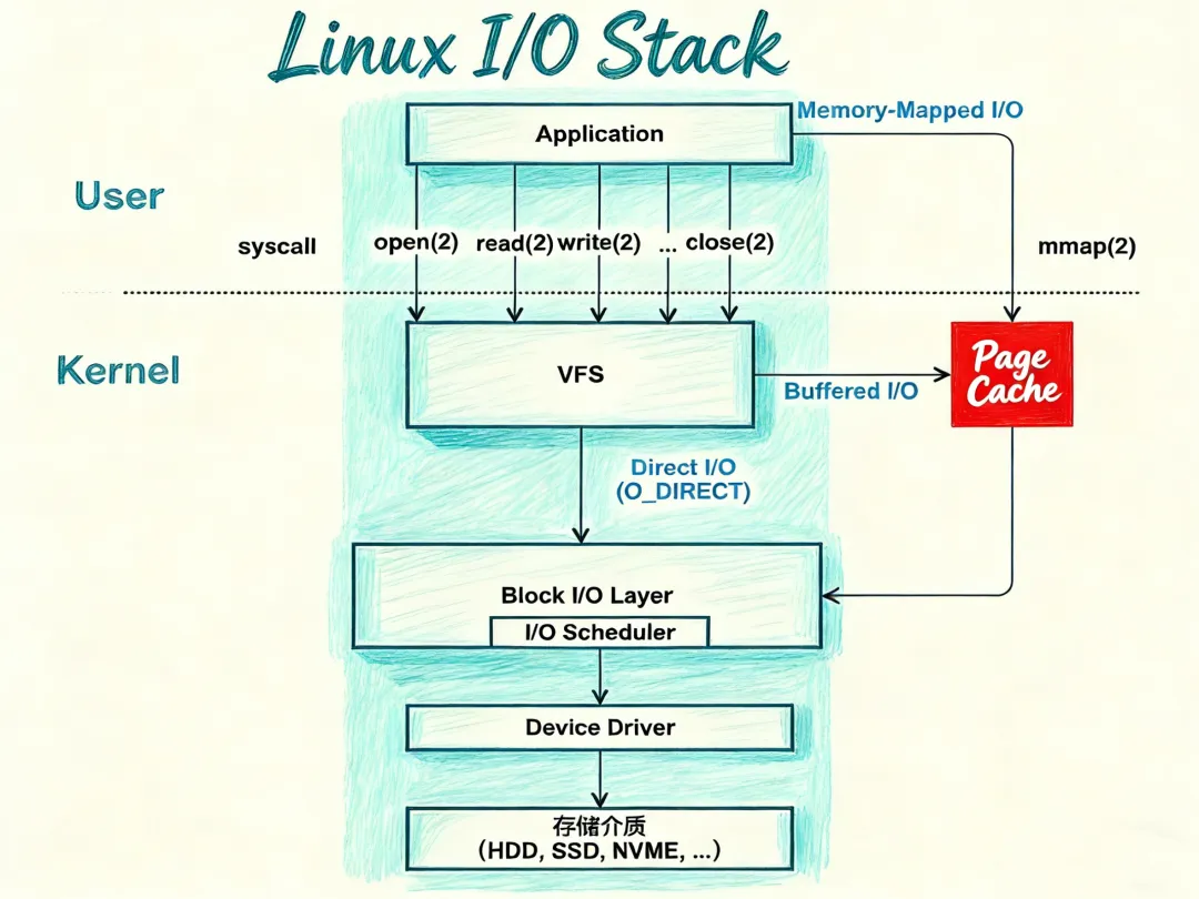 // Direct I/O 示例(打开文件时设置 O_DIRECT 标志)int fd = open("/data/db_file", O_RDWR | O_DIRECT);if (fd < 0) { perror("open failed"); return -1;}// 直接读写块设备,绕过页缓存read(fd, buf, 4096);close(fd);