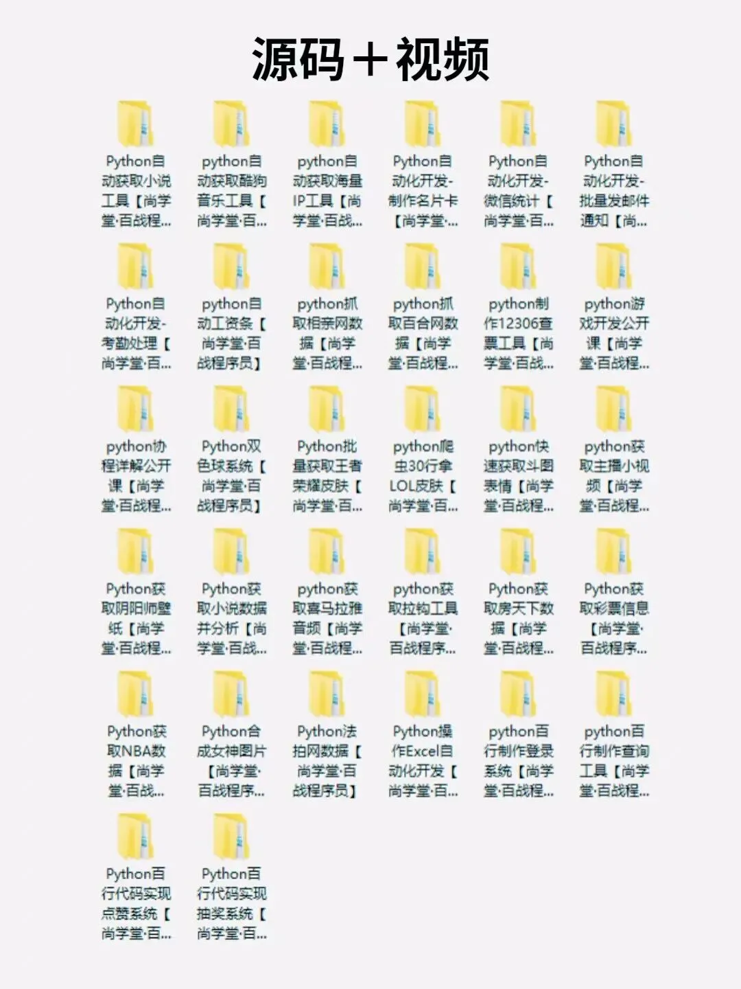 涵盖自动化、爬虫、数据分析、办公效率、娱乐工具、小游戏开发等六大方向,一共32个完整项目,每个都配有源码+详细视频教程,帮你从“学习”到“实战”,无缝衔接!