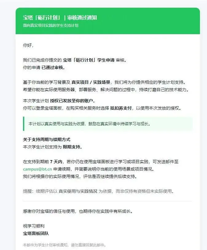 真实项目实践支持 | 已有正在运行的网站/服务,需长期稳定使用宝塔 | 1 个月/次 | 宝塔专业版(学生授权),每人仅限 1 个 | 到期前 1 周申请续期,仅校验使用状态,身份有效期内无需重复提交学生证明 |
