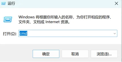 按下 Win + R,输入 cmd,回车打开命令提示符窗口。