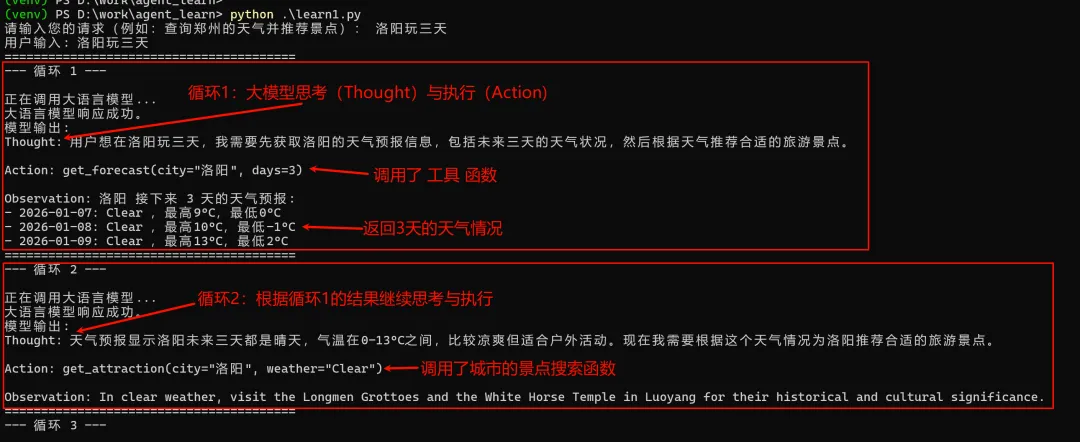 # 伪代码逻辑history = ["用户请求: 帮我查郑州天气并推荐景点"]while True: # 1. 让 LLM 思考 response = llm.generate(history) # 2. 解析 LLM 想要调用的工具 if "Action:" in response: tool_name, args = parse(response) # 3. 执行工具 (Python 真正执行函数的地方) result = tools[tool_name](**args) # 4. 将结果作为 Observation 存入历史 history.append(f"Observation: {result}") # 5. 如果 LLM 决定结束 if "finish" in response: print("最终答案:", final_answer) break