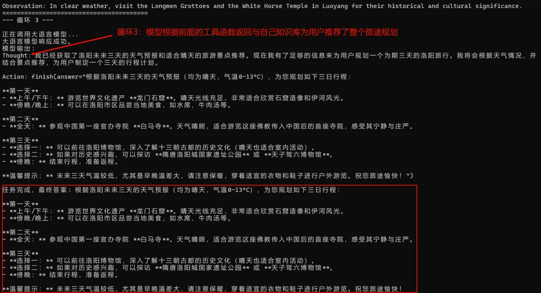 经过三轮的ReAct, 最终完成用户的旅途规划。