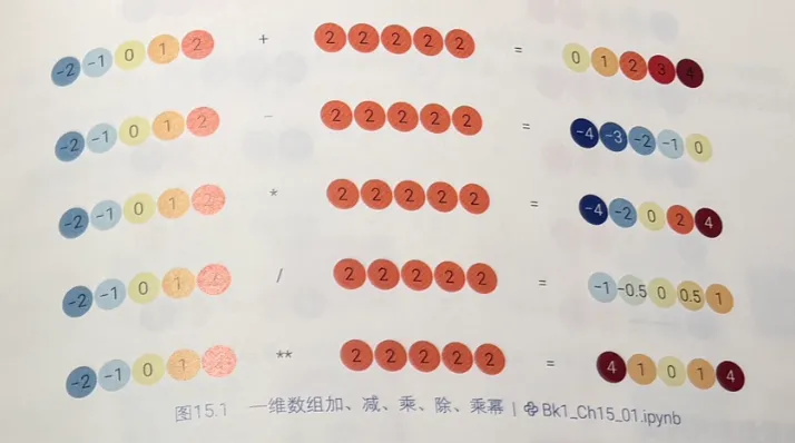 # 练习1.2:实现图15.1中的五种基本运算# 1. 加法add_result = a + b # 【思考:如何对两个数组进行逐元素加法?】➡️我试着直接加,结果真的一次成功!很奇妙哦!print("加法结果 (a + b):", add_result)# 2. 减法sub_result = a - bprint("减法结果 (a - b):", sub_result)# 3. 乘法mul_result = a * bprint("乘法结果 (a * b):", mul_result)# 4. 除法div_result = a / bprint("除法结果 (a / b):", div_result)# 5. 乘幂power_result = a ** bprint("乘幂结果 (a ** b):", power_result)print()